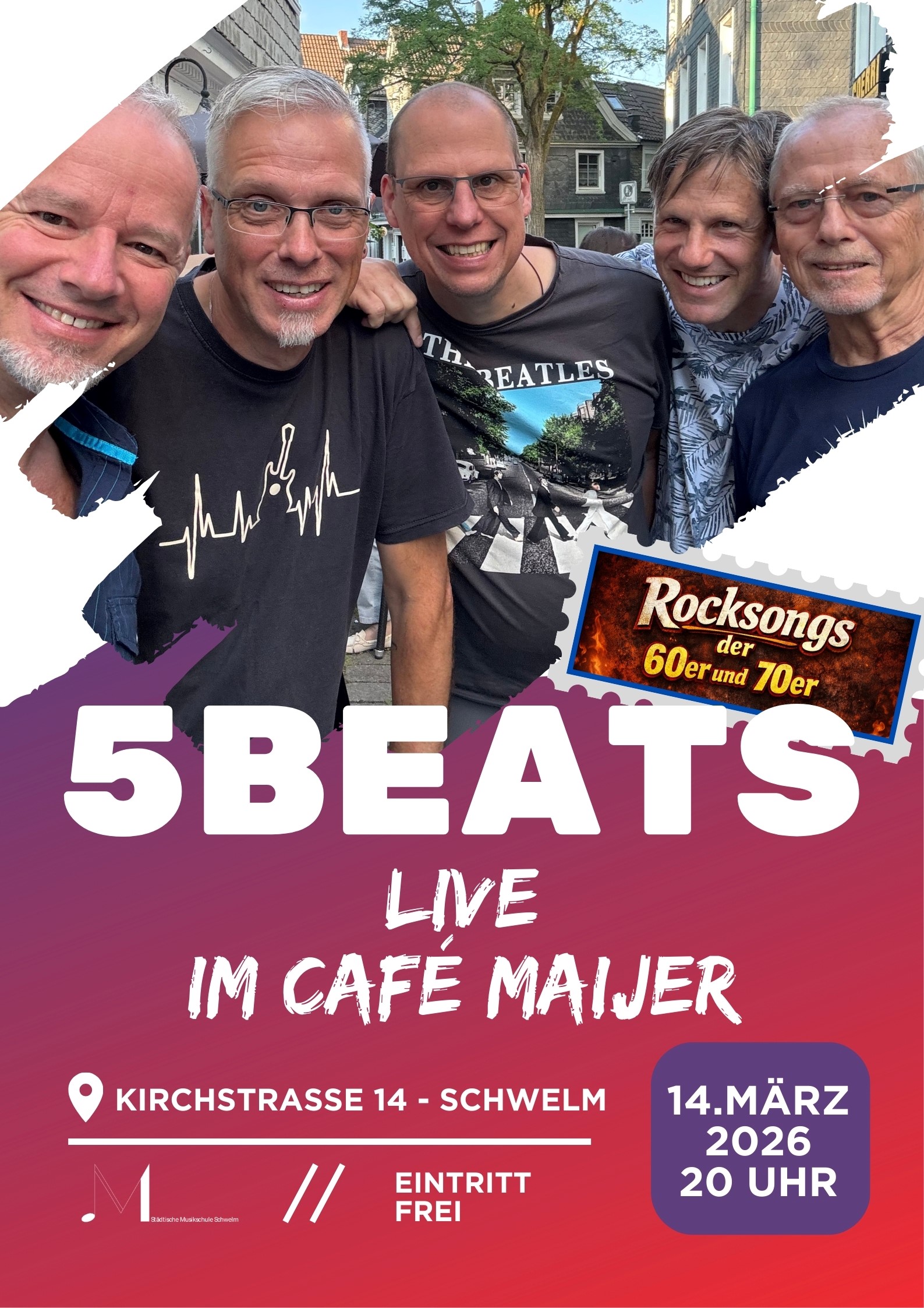 Am Samstag, den 14. März 2026, wird das Café Maijer in der Kirchstraße 14 in Schwelm erneut zur Bühne für handgemachte Livemusik. Ab 20:00 Uhr sorgt die Oldie-Band der Städtischen Musikschule Schwelm – die 5BEATS – für einen mitreißenden Abend. Der Eintritt ist frei!