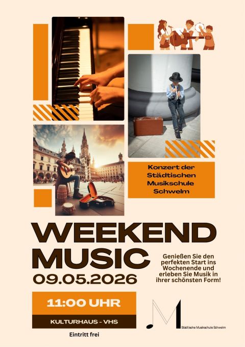 Am Samstag, den 9. Mai 2026, lädt die Städtische Musikschule Schwelm herzlich zum Konzert "Weekend Music" ein. Das Konzert beginnt um 11:00 Uhr und findet im Gesundheitsraum der VHS im Kulturhaus statt.