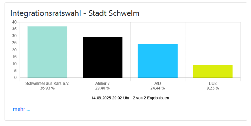 Ebenfalls im Rahmen der Kommunalwahlen 2025 wurde am 14. September auch der Integrationsrat neu gewählt. Dieser setzt sich nun aus den folgenden Gruppierungen und Parteien zusammen: Schwelmer aus Kars e.V. (36,93 Prozent, 2 Sitze), Atelier 7 (29,40 Prozent, 2 Sitze), AfD (24,44 Prozent, 1 Sitz), Deutsch-Ukrainisches Zentrum e.V. (DUZ) (9,23 Prozent, 1 Sitz). Insgesamt verfügt der Integrationsrat über 6 Sitze.