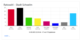 Auch beim neugewählten Stadtrat kommt es zu Änderungen. Hier stehen die endgültigen Wahlergebnisse bereits fest. So setzt sich das politische Entscheidungsgremium der Stadt Schwelm nun aus den folgenden Parteien zusammen CDU (24, 63 Prozent, 11 Sitze), SPD (22,71 Prozent, 10 Sitze), AfD (17,21 Prozent, 8 Sitze), GRÜNE (11,22 Prozent, 5 Sitze), FDP (10,13 Prozent, 5 Sitze), Die Linke (6,09 Prozent, 3 Sitze), BIZ (4,70 Prozent, 2 Sitze) und SWG/BfS (3,32 Prozent, 2 Sitze).