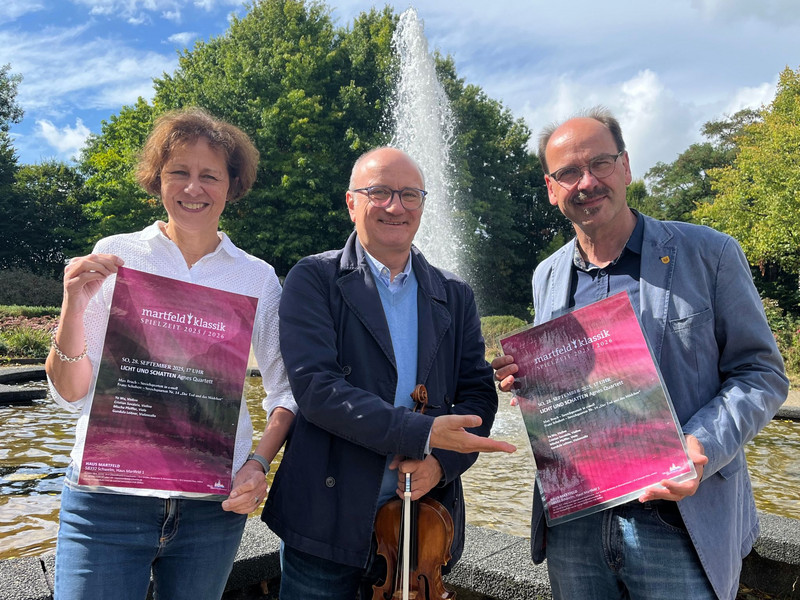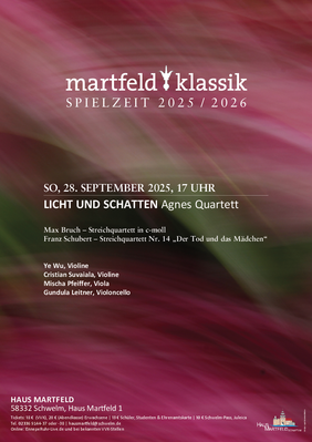 Das erste Konzert findet am Sonntag, den 28. September, um 17 Uhr mit dem Thema „Licht und Schatten“ statt. Es tritt das bereits bei Martfeld-Klassik-Besucherinnen und -Besuchern gut bekannte „Agnes-Quartett“ auf. Die vier Musikerinnen und Musiker legen zwischen ihren internationalen Auftritten einen kurzen Stopp in der Schwelmer Wasserburg ein und spielen von Max Bruch das Streichquartett in c-moll sowie von Franz Schubert das Streichquartett Nr. 14 „Der Tod und das Mädchen“. Gerade Letzteres, steht im Zusammenhang mit dem bekannten und gleichnamigen Gedicht von Matthias Claudius. Während Schubert in frühen Jahren diesem Gedicht zunächst eine Liedform gab, verändert er später in seinem Streichquartett den Tenor und stellt das düstere Todesmotiv in den Vordergrund. Ein Stück, dass den Zuhörerinnen und Zuhörern sicher unter die Haut gehen wird.