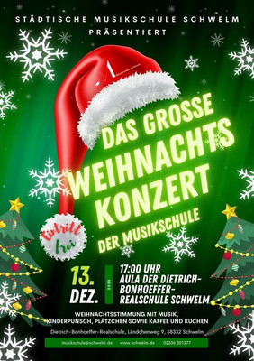 Weihnachten rückt näher und auch die Städtische Musikschule Schwelm sorgt für die passenden, stimmungsvollen Klänge. Am Samstag, den 13. Dezember laden die jungen Künstlerinnen und Künstler zum „Großen Weihnachtskonzert“ ein. Veranstaltungsort ist in diesem Jahr die Aula der Dietrich-Bonhoeffer-Realschule am Ländchenweg in Schwelm. Ab 17 Uhr verwandelt sich der Abend in ein klingendes Wintermärchen.