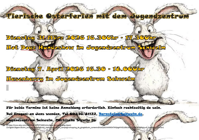 Kinder und Jugendliche können sich in den Osterferien über tierischen Besuch im Schwelmer Jugendzentrum freuen. Am Dienstag, den 31. März, von 16.30 bis 17.30 Uhr ist die Hundeshow „Hot Dogz“ zu Gast und am 7. April, von 16.30 bis 18.00 Uhr bringt Hasen-Harry seinen Kleintierzoo zum Anschauen und Bestaunen in die Jugendräume an der Märkische Straße 16.