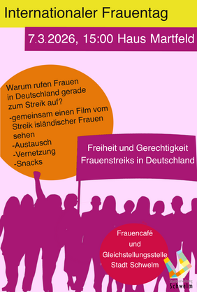 Unter dem Motto „Freiheit und Gerechtigkeit – Frauenstreiks in Deutschland“ lädt das Frauencafé gemeinsam mit der Gleichstellungsstelle Schwelm alle Frauen anlässlich des Internationalen Frauentags am 7. März 2026, um 15 Uhr ins Haus Martfeld ein. Einlass zur Veranstaltung ist bereits ab 14.30 Uhr. Der Eintritt ist frei.