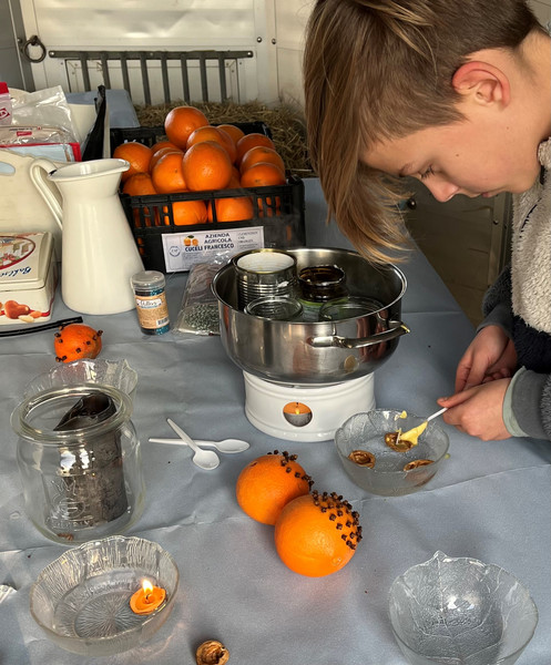 Für die kleinen Gäste gab es zudem eine inspirierende Mitmachaktion, die für kreative und duftende Weihnachtsmomente sorgte: Mit viel Freude wurden Schwimmkerzen gegossen und sogenannte „Pomander“ gebastelt – eine traditionelle, stimmungsvolle Dekoration der Weihnachtszeit. Dabei steckten die Kinder Gewürznelken in frische Orangen, oft in liebevollen Mustern, sodass ein warmer, würziger Duft entstand, der den Hof noch ein wenig weihnachtlicher machte.