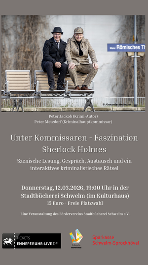 - 12.03.2026, 19 Uhr: Unter Kommissaren: Faszination Sherlock Holmes - Szenische Lesung, Gespräch, Austausch und ein interaktives kriminalistisches Rätsel in der Stadtbücherei Schwelm, 15 Euro.